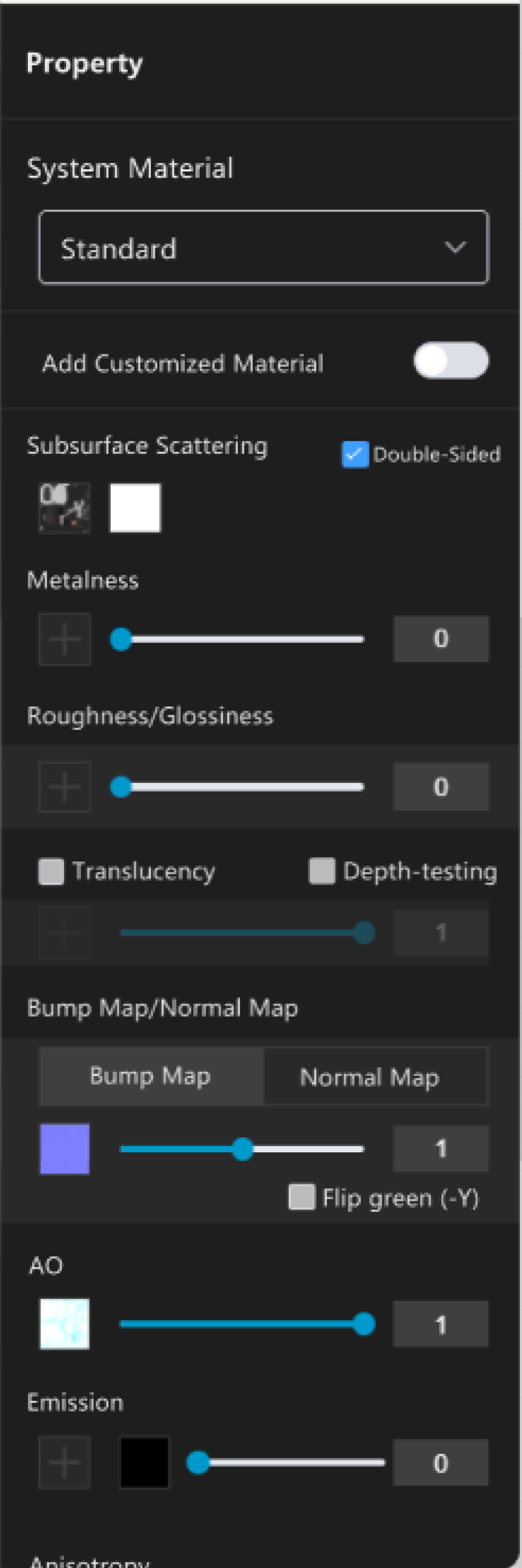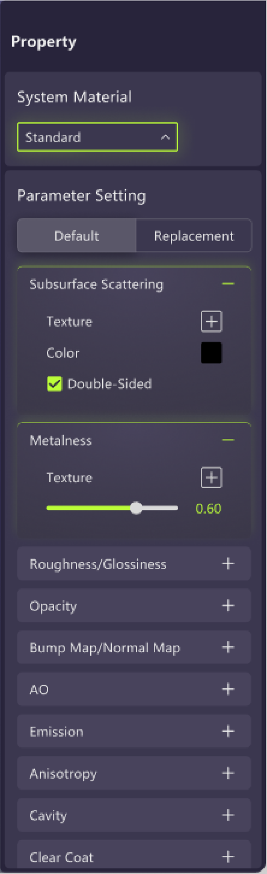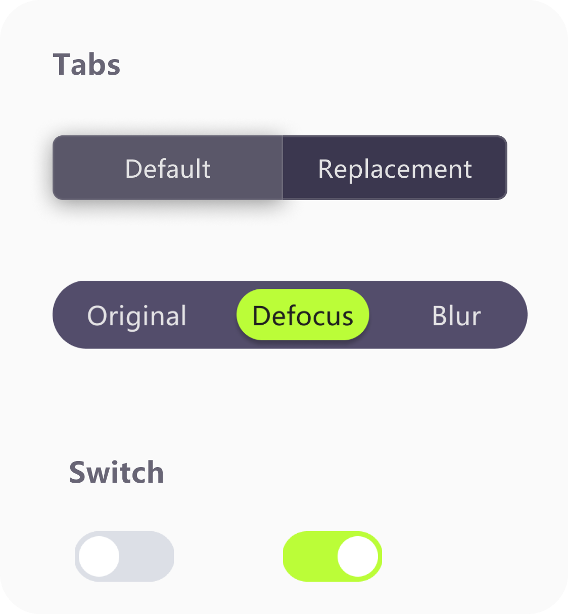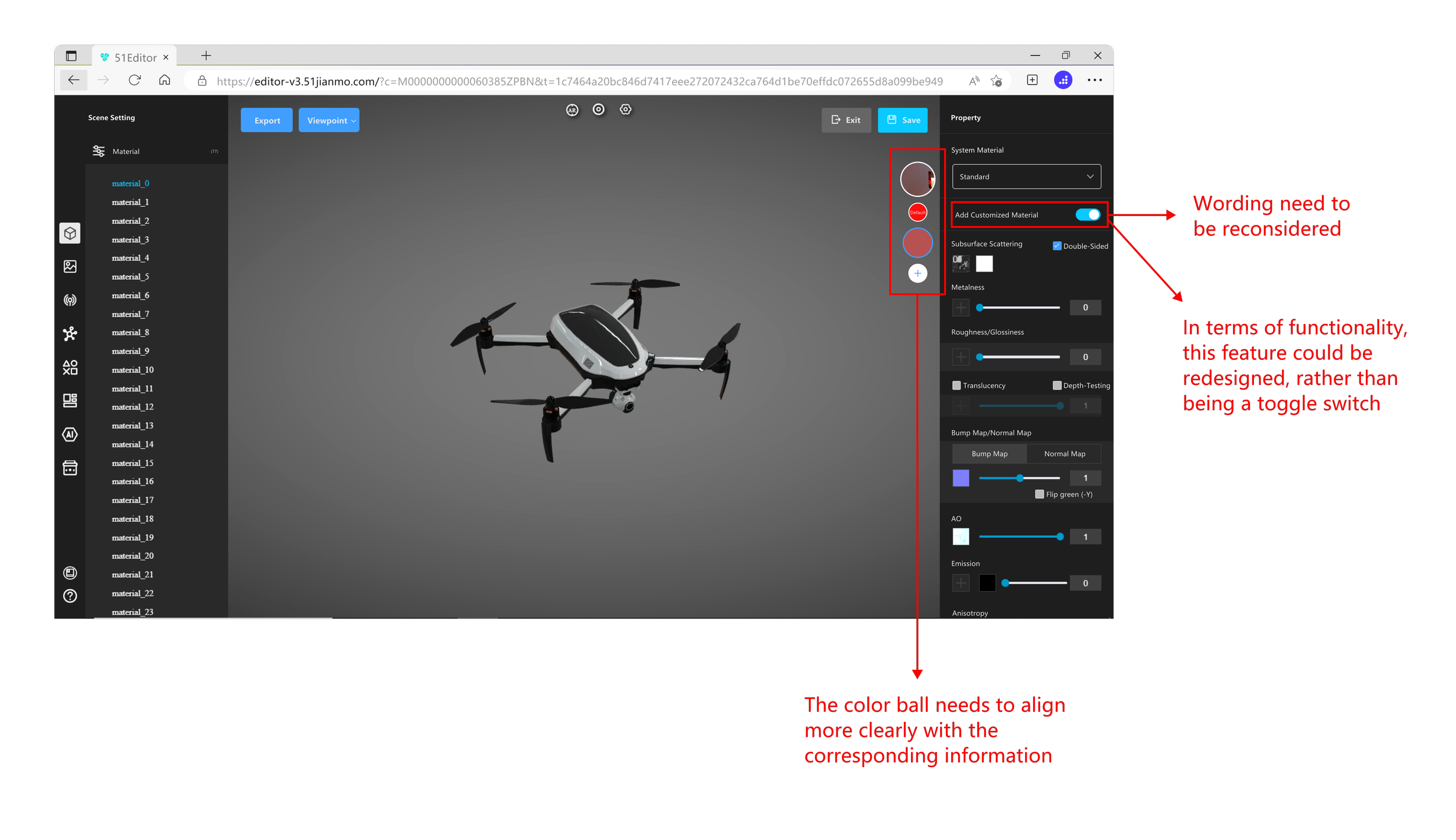 Problem: The customized material feature in the original editor is presented as a toggle switch—off for the default material set and on for the replacement material set. However, the information lacks clear direction, and there is a risk that users may lose their replacement material if they turn off the switch, making it difficult to understand how it aligns with the corresponding feature.