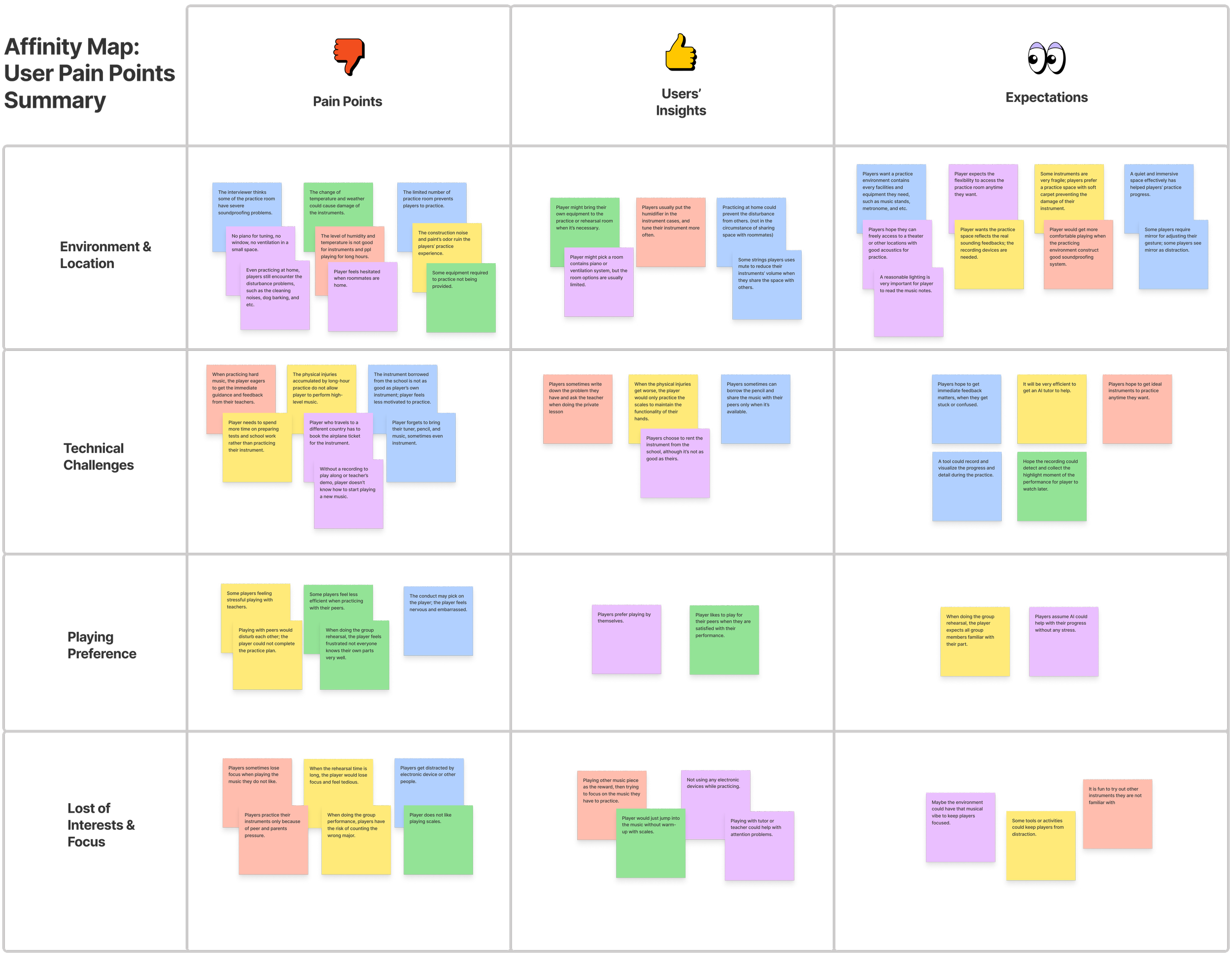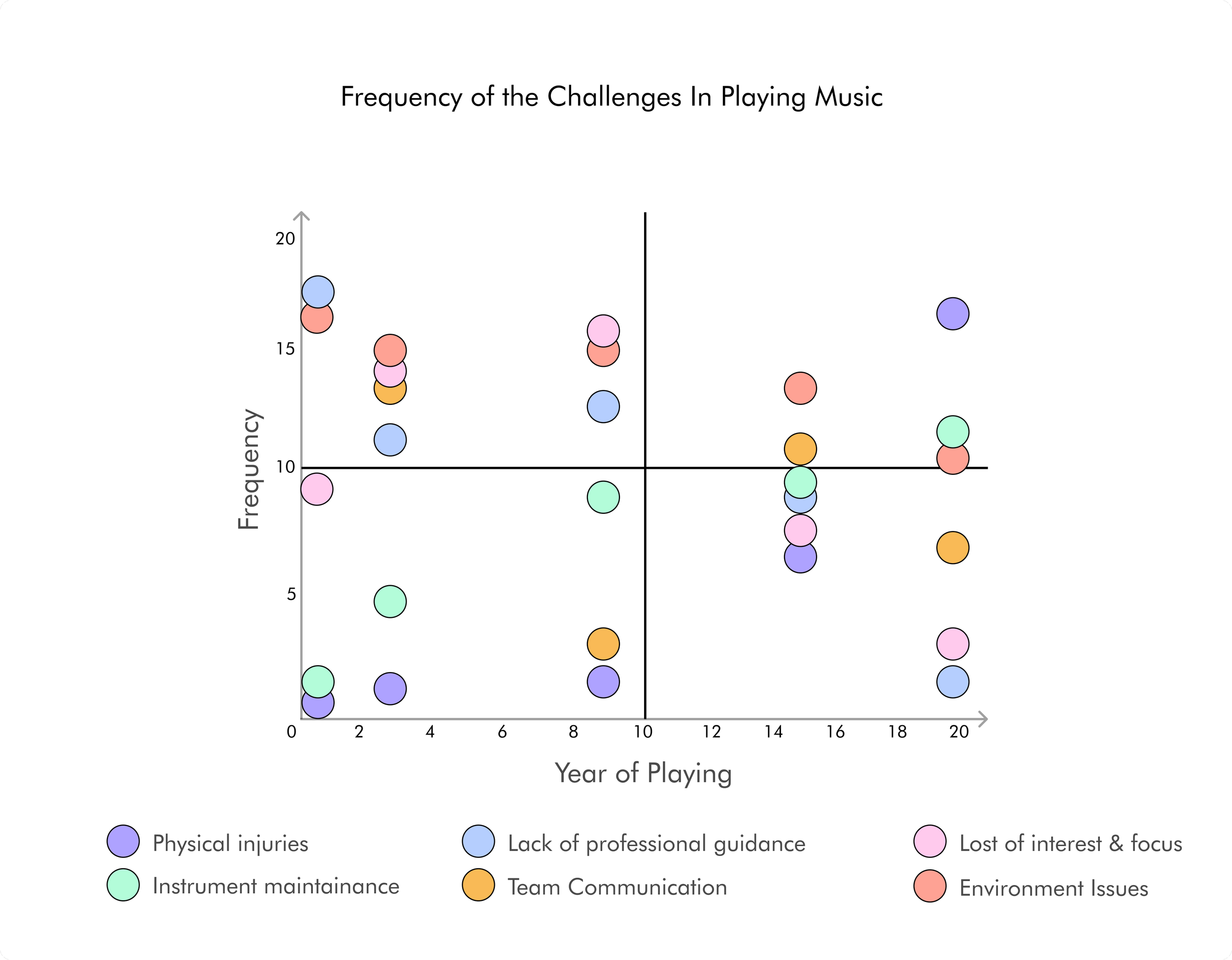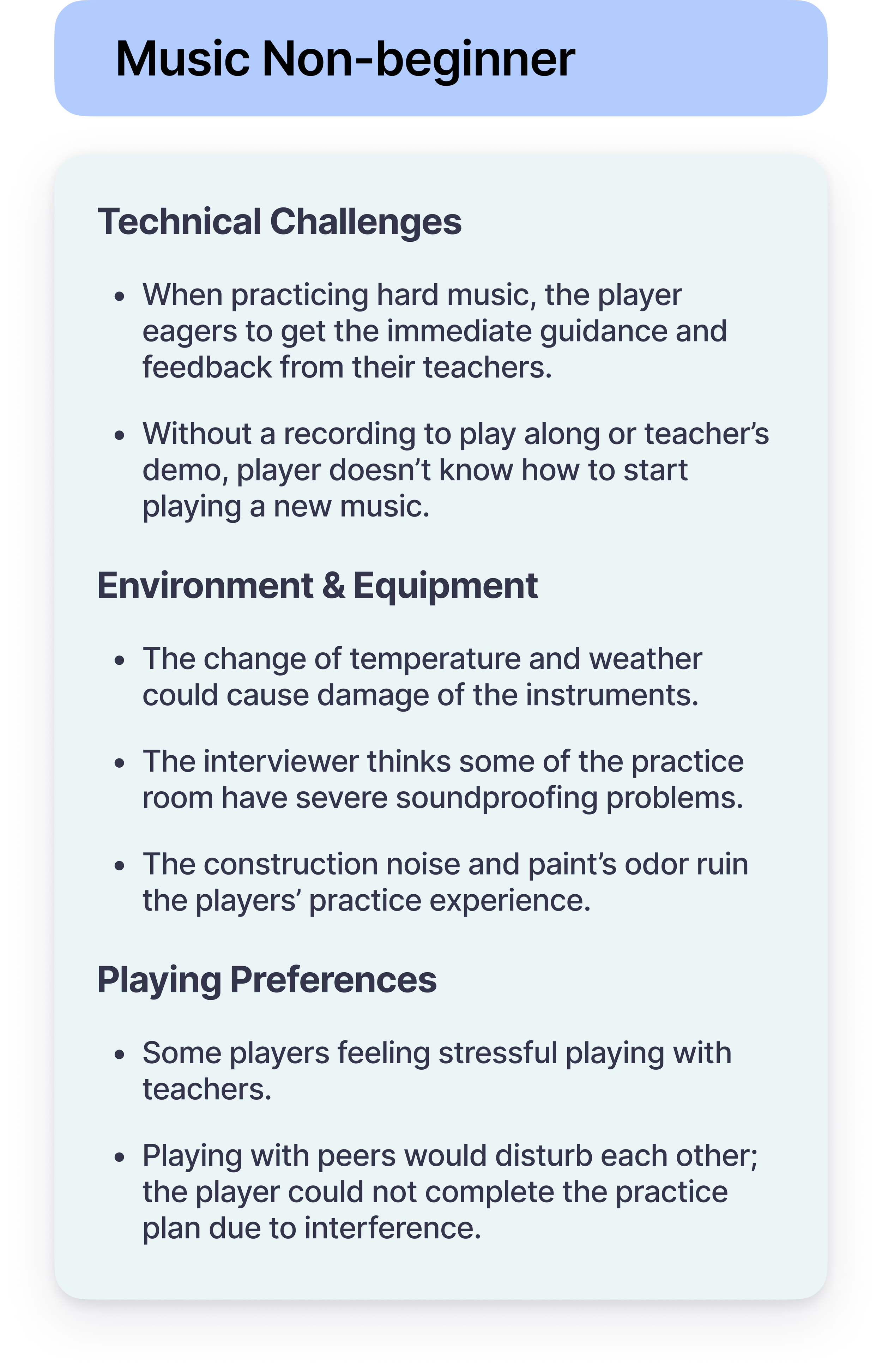 After conducting an interview to understand the pain points of interviewers, I synthesized 6 types of challenges they have. Here is the distribution of the frequency of music-playing challenges.